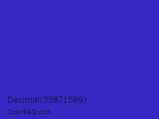 Decimal 55871589 Color is a normal indigo color and the nearest color is Governor Bay #2f3cb3. Hex code #3626c1 and RGB value is rgb(54,38,193). In RGB color space, this color is composed of 21% red, 15% green, 76% blue, In CMYK color space, this color is composed of 72% cyan, 80% magenta, 0% yellow , 24% black , In HSL color space, this color has a hue angle of 246° , 67% saturation and 45% lightness.