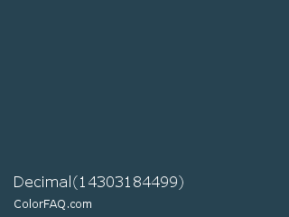 Decimal 14303184499 Color is a dark blue color and the nearest color is Blue Dianne #204852. Hex code #274351 and RGB value is rgb(39,67,81). In RGB color space, this color is composed of 15% red, 26% green, 32% blue, In CMYK color space, this color is composed of 52% cyan, 17% magenta, 0% yellow , 68% black , In HSL color space, this color has a hue angle of 200° , 35% saturation and 24% lightness.