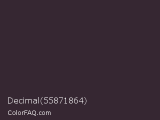 Decimal 55871864 Color is a very dark magenta color and the nearest color is Thunder #33292f. Hex code #362732 and RGB value is rgb(54,39,50). In RGB color space, this color is composed of 21% red, 15% green, 20% blue, In CMYK color space, this color is composed of 0% cyan, 28% magenta, 7% yellow , 79% black , In HSL color space, this color has a hue angle of 316° , 16% saturation and 18% lightness.