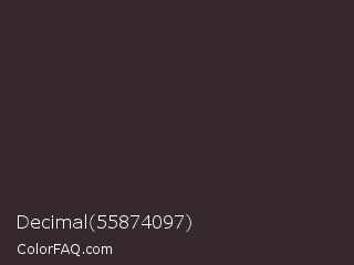 Decimal 55874097 Color is a very dark rose color and the nearest color is Thunder #33292f. Hex code #36282f and RGB value is rgb(54,40,47). In RGB color space, this color is composed of 21% red, 16% green, 18% blue, In CMYK color space, this color is composed of 0% cyan, 26% magenta, 13% yellow , 79% black , In HSL color space, this color has a hue angle of 330° , 15% saturation and 18% lightness.