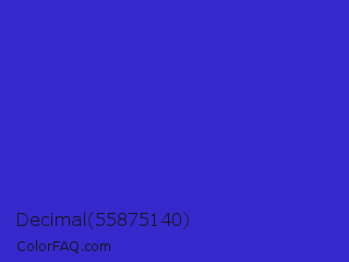 Decimal 55875140 Color is a normal indigo color and the nearest color is Interdimensional Blue #360ccc. Hex code #3629cc and RGB value is rgb(54,41,204). In RGB color space, this color is composed of 21% red, 16% green, 80% blue, In CMYK color space, this color is composed of 74% cyan, 80% magenta, 0% yellow , 20% black , In HSL color space, this color has a hue angle of 245° , 67% saturation and 48% lightness.
