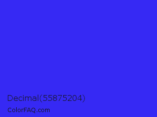 Decimal 55875204 Color is a normal indigo color and the nearest color is Bluebonnet #1c1cf0. Hex code #3629f4 and RGB value is rgb(54,41,244). In RGB color space, this color is composed of 21% red, 16% green, 96% blue, In CMYK color space, this color is composed of 78% cyan, 83% magenta, 0% yellow , 4% black , In HSL color space, this color has a hue angle of 244° , 90% saturation and 56% lightness.