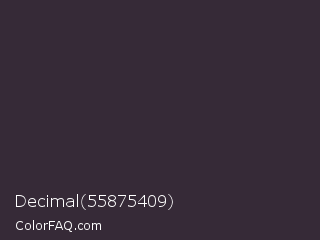 Decimal 55875409 Color is a very dark magenta color and the nearest color is Blackcurrant #32293a. Hex code #362a37 and RGB value is rgb(54,42,55). In RGB color space, this color is composed of 21% red, 16% green, 22% blue, In CMYK color space, this color is composed of 2% cyan, 24% magenta, 0% yellow , 78% black , In HSL color space, this color has a hue angle of 295° , 13% saturation and 19% lightness.