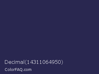 Decimal 14311064950 Color is a dark indigo color and the nearest color is Port Gore #251f4f. Hex code #292750 and RGB value is rgb(41,39,80). In RGB color space, this color is composed of 16% red, 15% green, 31% blue, In CMYK color space, this color is composed of 49% cyan, 51% magenta, 0% yellow , 69% black , In HSL color space, this color has a hue angle of 243° , 34% saturation and 23% lightness.