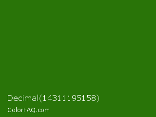 Decimal 14311195158 Color is a dark green color and the nearest color is Napier Green #2a8000. Hex code #297408 and RGB value is rgb(41,116,8). In RGB color space, this color is composed of 16% red, 45% green, 3% blue, In CMYK color space, this color is composed of 65% cyan, 0% magenta, 93% yellow , 55% black , In HSL color space, this color has a hue angle of 102° , 87% saturation and 24% lightness.