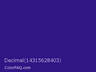 Decimal 14315628403 Color is a dark indigo color and the nearest color is Pixie Powder #391285. Hex code #301585 and RGB value is rgb(48,21,133). In RGB color space, this color is composed of 19% red, 8% green, 52% blue, In CMYK color space, this color is composed of 64% cyan, 84% magenta, 0% yellow , 48% black , In HSL color space, this color has a hue angle of 254° , 73% saturation and 30% lightness.