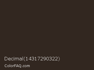 Decimal 14317290322 Color is a very dark orange color and the nearest color is Cocoa Brown #301f1e. Hex code #322720 and RGB value is rgb(50,39,32). In RGB color space, this color is composed of 20% red, 15% green, 13% blue, In CMYK color space, this color is composed of 0% cyan, 22% magenta, 36% yellow , 80% black , In HSL color space, this color has a hue angle of 23° , 22% saturation and 16% lightness.