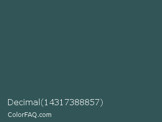 Decimal 14317388857 Color is a dark cyan color and the nearest color is Spectra #2f5a57. Hex code #325657 and RGB value is rgb(50,86,87). In RGB color space, this color is composed of 20% red, 34% green, 34% blue, In CMYK color space, this color is composed of 43% cyan, 1% magenta, 0% yellow , 66% black , In HSL color space, this color has a hue angle of 182° , 27% saturation and 27% lightness.