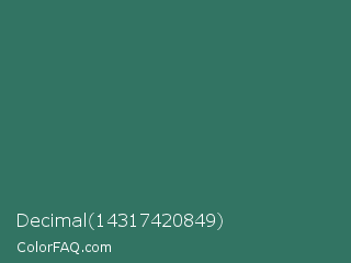 Decimal 14317420849 Color is a normal cyan color and the nearest color is Amazon #3b7a57. Hex code #327463 and RGB value is rgb(50,116,99). In RGB color space, this color is composed of 20% red, 45% green, 39% blue, In CMYK color space, this color is composed of 57% cyan, 0% magenta, 15% yellow , 55% black , In HSL color space, this color has a hue angle of 165° , 40% saturation and 33% lightness.