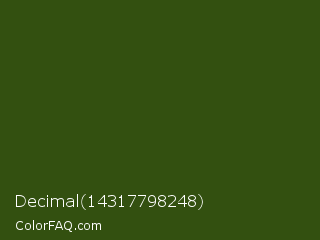 Decimal 14317798248 Color is a very dark green color and the nearest color is Clover #384910. Hex code #335010 and RGB value is rgb(51,80,16). In RGB color space, this color is composed of 20% red, 31% green, 6% blue, In CMYK color space, this color is composed of 36% cyan, 0% magenta, 80% yellow , 69% black , In HSL color space, this color has a hue angle of 87° , 67% saturation and 19% lightness.