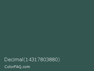 Decimal 14317803880 Color is a dark cyan color and the nearest color is Stromboli #325d52. Hex code #335650 and RGB value is rgb(51,86,80). In RGB color space, this color is composed of 20% red, 34% green, 31% blue, In CMYK color space, this color is composed of 41% cyan, 0% magenta, 7% yellow , 66% black , In HSL color space, this color has a hue angle of 170° , 26% saturation and 27% lightness.