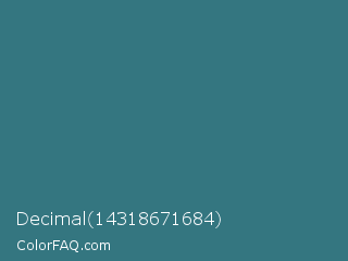 Decimal 14318671684 Color is a normal cyan color and the nearest color is Ming #36747d. Hex code #347680 and RGB value is rgb(52,118,128). In RGB color space, this color is composed of 20% red, 46% green, 50% blue, In CMYK color space, this color is composed of 59% cyan, 8% magenta, 0% yellow , 50% black , In HSL color space, this color has a hue angle of 188° , 42% saturation and 35% lightness.