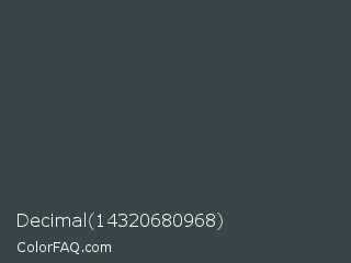 Decimal 14320680968 Color is a dark cyan color and the nearest color is Arsenic #3b444b. Hex code #374648 and RGB value is rgb(55,70,72). In RGB color space, this color is composed of 22% red, 27% green, 28% blue, In CMYK color space, this color is composed of 24% cyan, 3% magenta, 0% yellow , 72% black , In HSL color space, this color has a hue angle of 187° , 13% saturation and 25% lightness.