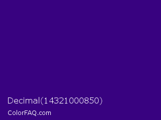 Decimal 14321000850 Color is a dark violet color and the nearest color is Kingfisher Daisy #3e0480. Hex code #380280 and RGB value is rgb(56,2,128). In RGB color space, this color is composed of 22% red, 1% green, 50% blue, In CMYK color space, this color is composed of 56% cyan, 98% magenta, 0% yellow , 50% black , In HSL color space, this color has a hue angle of 266° , 97% saturation and 25% lightness.