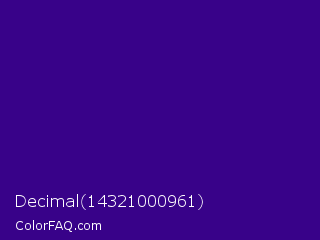 Decimal 14321000961 Color is a dark violet color and the nearest color is Kingfisher Daisy #3e0480. Hex code #380289 and RGB value is rgb(56,2,137). In RGB color space, this color is composed of 22% red, 1% green, 54% blue, In CMYK color space, this color is composed of 59% cyan, 99% magenta, 0% yellow , 46% black , In HSL color space, this color has a hue angle of 264° , 97% saturation and 27% lightness.