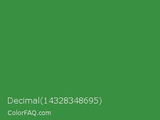 Decimal 14328348695 Color is a normal green color and the nearest color is May Green #4c9141. Hex code #399041 and RGB value is rgb(57,144,65). In RGB color space, this color is composed of 22% red, 56% green, 25% blue, In CMYK color space, this color is composed of 60% cyan, 0% magenta, 55% yellow , 44% black , In HSL color space, this color has a hue angle of 126° , 43% saturation and 39% lightness.
