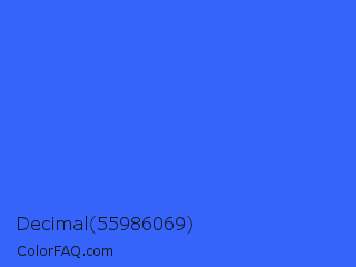 Decimal 55986069 Color is a normal blue color and the nearest color is Ultramarine Blue #4166f5. Hex code #3664fb and RGB value is rgb(54,100,251). In RGB color space, this color is composed of 21% red, 39% green, 98% blue, In CMYK color space, this color is composed of 78% cyan, 60% magenta, 0% yellow , 2% black , In HSL color space, this color has a hue angle of 226° , 96% saturation and 60% lightness.
