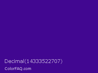 Decimal 14333522707 Color is a dark violet color and the nearest color is Kingfisher Daisy #3e0480. Hex code #410791 and RGB value is rgb(65,7,145). In RGB color space, this color is composed of 25% red, 3% green, 57% blue, In CMYK color space, this color is composed of 55% cyan, 95% magenta, 0% yellow , 43% black , In HSL color space, this color has a hue angle of 265° , 91% saturation and 30% lightness.