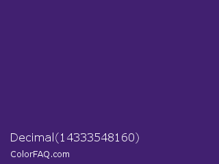 Decimal 14333548160 Color is a dark violet color and the nearest color is Meteorite #3c1f76. Hex code #412070 and RGB value is rgb(65,32,112). In RGB color space, this color is composed of 25% red, 13% green, 44% blue, In CMYK color space, this color is composed of 42% cyan, 71% magenta, 0% yellow , 56% black , In HSL color space, this color has a hue angle of 265° , 56% saturation and 28% lightness.