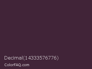 Decimal 14333576776 Color is a very dark magenta color and the nearest color is Old Burgundy #43302e. Hex code #412438 and RGB value is rgb(65,36,56). In RGB color space, this color is composed of 25% red, 14% green, 22% blue, In CMYK color space, this color is composed of 0% cyan, 45% magenta, 14% yellow , 75% black , In HSL color space, this color has a hue angle of 319° , 29% saturation and 20% lightness.