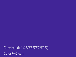 Decimal 14333577625 Color is a normal indigo color and the nearest color is Daisy Bush #4f2398. Hex code #412597 and RGB value is rgb(65,37,151). In RGB color space, this color is composed of 25% red, 15% green, 59% blue, In CMYK color space, this color is composed of 57% cyan, 75% magenta, 0% yellow , 41% black , In HSL color space, this color has a hue angle of 255° , 61% saturation and 37% lightness.