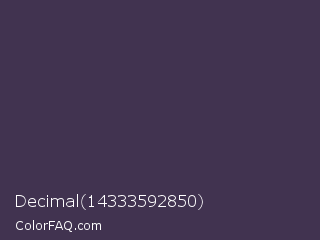Decimal 14333592850 Color is a dark violet color and the nearest color is Martinique #363050. Hex code #413350 and RGB value is rgb(65,51,80). In RGB color space, this color is composed of 25% red, 20% green, 31% blue, In CMYK color space, this color is composed of 19% cyan, 36% magenta, 0% yellow , 69% black , In HSL color space, this color has a hue angle of 269° , 22% saturation and 26% lightness.