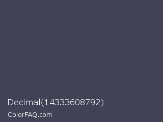 Decimal 14333608792 Color is a dark blue color and the nearest color is Gun Powder #414257. Hex code #414256 and RGB value is rgb(65,66,86). In RGB color space, this color is composed of 25% red, 26% green, 34% blue, In CMYK color space, this color is composed of 24% cyan, 23% magenta, 0% yellow , 66% black , In HSL color space, this color has a hue angle of 237° , 14% saturation and 30% lightness.