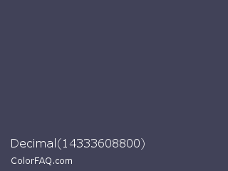 Decimal 14333608800 Color is a dark blue color and the nearest color is Gun Powder #414257. Hex code #414258 and RGB value is rgb(65,66,88). In RGB color space, this color is composed of 25% red, 26% green, 35% blue, In CMYK color space, this color is composed of 26% cyan, 25% magenta, 0% yellow , 65% black , In HSL color space, this color has a hue angle of 237° , 15% saturation and 30% lightness.