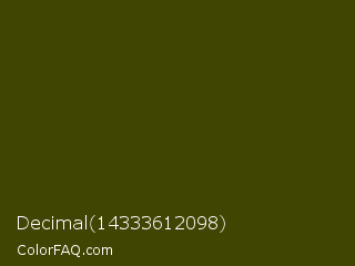 Decimal 14333612098 Color is a very dark yellow color and the nearest color is Bronze Olive #4e420c. Hex code #414502 and RGB value is rgb(65,69,2). In RGB color space, this color is composed of 25% red, 27% green, 1% blue, In CMYK color space, this color is composed of 6% cyan, 0% magenta, 97% yellow , 73% black , In HSL color space, this color has a hue angle of 64° , 94% saturation and 14% lightness.