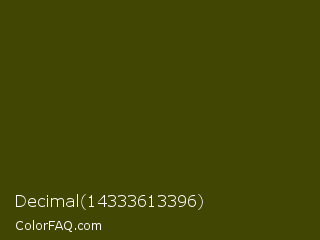 Decimal 14333613396 Color is a very dark yellow color and the nearest color is Verdun Green #495400. Hex code #414702 and RGB value is rgb(65,71,2). In RGB color space, this color is composed of 25% red, 28% green, 1% blue, In CMYK color space, this color is composed of 8% cyan, 0% magenta, 97% yellow , 72% black , In HSL color space, this color has a hue angle of 65° , 95% saturation and 14% lightness.