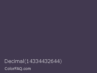Decimal 14334432644 Color is a dark violet color and the nearest color is Bright Gray #3c4151. Hex code #423950 and RGB value is rgb(66,57,80). In RGB color space, this color is composed of 26% red, 22% green, 31% blue, In CMYK color space, this color is composed of 18% cyan, 29% magenta, 0% yellow , 69% black , In HSL color space, this color has a hue angle of 263° , 17% saturation and 27% lightness.