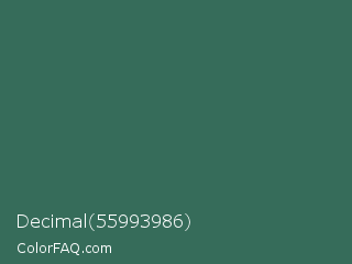 Decimal 55993986 Color is a normal green color and the nearest color is Amazon #3b7a57. Hex code #366c5a and RGB value is rgb(54,108,90). In RGB color space, this color is composed of 21% red, 42% green, 35% blue, In CMYK color space, this color is composed of 50% cyan, 0% magenta, 17% yellow , 58% black , In HSL color space, this color has a hue angle of 160° , 33% saturation and 32% lightness.