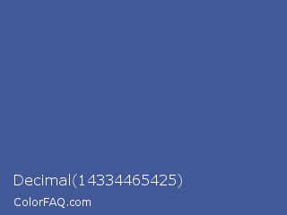 Decimal 14334465425 Color is a normal blue color and the nearest color is Queen Blue #436b95. Hex code #425897 and RGB value is rgb(66,88,151). In RGB color space, this color is composed of 26% red, 35% green, 59% blue, In CMYK color space, this color is composed of 56% cyan, 42% magenta, 0% yellow , 41% black , In HSL color space, this color has a hue angle of 224° , 39% saturation and 43% lightness.