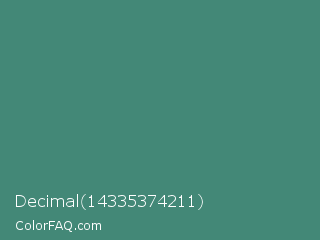 Decimal 14335374211 Color is a normal cyan color and the nearest color is Viridian #40826d. Hex code #438877 and RGB value is rgb(67,136,119). In RGB color space, this color is composed of 26% red, 53% green, 47% blue, In CMYK color space, this color is composed of 51% cyan, 0% magenta, 13% yellow , 47% black , In HSL color space, this color has a hue angle of 165° , 34% saturation and 40% lightness.