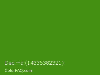 Decimal 14335382321 Color is a normal green color and the nearest color is La Palma #368716. Hex code #439013 and RGB value is rgb(67,144,19). In RGB color space, this color is composed of 26% red, 56% green, 7% blue, In CMYK color space, this color is composed of 53% cyan, 0% magenta, 87% yellow , 44% black , In HSL color space, this color has a hue angle of 97° , 77% saturation and 32% lightness.
