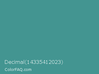 Decimal 14335412023 Color is a normal cyan color and the nearest color is Zomp #39a78e. Hex code #439591 and RGB value is rgb(67,149,145). In RGB color space, this color is composed of 26% red, 58% green, 57% blue, In CMYK color space, this color is composed of 55% cyan, 0% magenta, 3% yellow , 42% black , In HSL color space, this color has a hue angle of 177° , 38% saturation and 42% lightness.