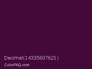 Decimal 14335607621 Color is a very dark magenta color and the nearest color is Loulou #460b41. Hex code #440939 and RGB value is rgb(68,9,57). In RGB color space, this color is composed of 27% red, 4% green, 22% blue, In CMYK color space, this color is composed of 0% cyan, 87% magenta, 16% yellow , 73% black , In HSL color space, this color has a hue angle of 311° , 77% saturation and 15% lightness.