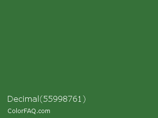 Decimal 55998761 Color is a normal green color and the nearest color is Killarney #3a6a47. Hex code #367139 and RGB value is rgb(54,113,57). In RGB color space, this color is composed of 21% red, 44% green, 22% blue, In CMYK color space, this color is composed of 52% cyan, 0% magenta, 50% yellow , 56% black , In HSL color space, this color has a hue angle of 123° , 35% saturation and 33% lightness.