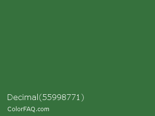Decimal 55998771 Color is a normal green color and the nearest color is Killarney #3a6a47. Hex code #36713d and RGB value is rgb(54,113,61). In RGB color space, this color is composed of 21% red, 44% green, 24% blue, In CMYK color space, this color is composed of 52% cyan, 0% magenta, 46% yellow , 56% black , In HSL color space, this color has a hue angle of 127° , 35% saturation and 33% lightness.