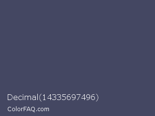 Decimal 14335697496 Color is a normal blue color and the nearest color is Mulled Wine #4e4562. Hex code #444762 and RGB value is rgb(68,71,98). In RGB color space, this color is composed of 27% red, 28% green, 38% blue, In CMYK color space, this color is composed of 31% cyan, 28% magenta, 0% yellow , 62% black , In HSL color space, this color has a hue angle of 234° , 18% saturation and 33% lightness.