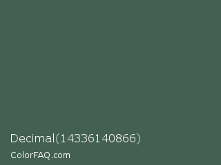 Decimal 14336140866 Color is a normal green color and the nearest color is Mineral Green #3f5d53. Hex code #446052 and RGB value is rgb(68,96,82). In RGB color space, this color is composed of 27% red, 38% green, 32% blue, In CMYK color space, this color is composed of 29% cyan, 0% magenta, 15% yellow , 62% black , In HSL color space, this color has a hue angle of 150° , 17% saturation and 32% lightness.