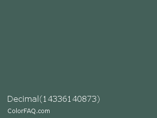 Decimal 14336140873 Color is a normal cyan color and the nearest color is Mineral Green #3f5d53. Hex code #446059 and RGB value is rgb(68,96,89). In RGB color space, this color is composed of 27% red, 38% green, 35% blue, In CMYK color space, this color is composed of 29% cyan, 0% magenta, 7% yellow , 62% black , In HSL color space, this color has a hue angle of 165° , 17% saturation and 32% lightness.