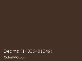 Decimal 14336481349 Color is a very dark orange color and the nearest color is Iroko #433120. Hex code #453025 and RGB value is rgb(69,48,37). In RGB color space, this color is composed of 27% red, 19% green, 15% blue, In CMYK color space, this color is composed of 0% cyan, 30% magenta, 46% yellow , 73% black , In HSL color space, this color has a hue angle of 21° , 30% saturation and 21% lightness.
