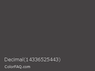 Decimal 14336525443 Color is a dark rose color and the nearest color is Tundora #4a4244. Hex code #454243 and RGB value is rgb(69,66,67). In RGB color space, this color is composed of 27% red, 26% green, 26% blue, In CMYK color space, this color is composed of 0% cyan, 4% magenta, 3% yellow , 73% black , In HSL color space, this color has a hue angle of 340° , 2% saturation and 26% lightness.