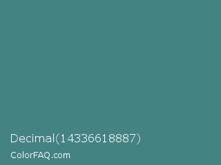 Decimal 14336618887 Color is a normal cyan color and the nearest color is Faded Jade #427977. Hex code #458383 and RGB value is rgb(69,131,131). In RGB color space, this color is composed of 27% red, 51% green, 51% blue, In CMYK color space, this color is composed of 47% cyan, 0% magenta, 0% yellow , 49% black , In HSL color space, this color has a hue angle of 180° , 31% saturation and 39% lightness.