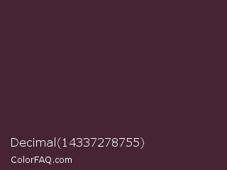 Decimal 14337278755 Color is a very dark rose color and the nearest color is Livid Brown #4d282e. Hex code #462433 and RGB value is rgb(70,36,51). In RGB color space, this color is composed of 27% red, 14% green, 20% blue, In CMYK color space, this color is composed of 0% cyan, 49% magenta, 27% yellow , 73% black , In HSL color space, this color has a hue angle of 334° , 32% saturation and 21% lightness.
