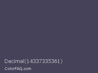 Decimal 14337335361 Color is a dark indigo color and the nearest color is Gun Powder #414257. Hex code #464259 and RGB value is rgb(70,66,89). In RGB color space, this color is composed of 27% red, 26% green, 35% blue, In CMYK color space, this color is composed of 21% cyan, 26% magenta, 0% yellow , 65% black , In HSL color space, this color has a hue angle of 250° , 15% saturation and 30% lightness.