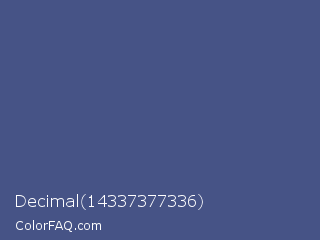 Decimal 14337377336 Color is a normal blue color and the nearest color is Purple Navy #4e5180. Hex code #465386 and RGB value is rgb(70,83,134). In RGB color space, this color is composed of 27% red, 33% green, 53% blue, In CMYK color space, this color is composed of 48% cyan, 38% magenta, 0% yellow , 47% black , In HSL color space, this color has a hue angle of 228° , 31% saturation and 40% lightness.