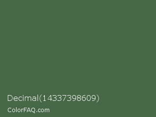 Decimal 14337398609 Color is a normal green color and the nearest color is Axolotl #4e6649. Hex code #466847 and RGB value is rgb(70,104,71). In RGB color space, this color is composed of 27% red, 41% green, 28% blue, In CMYK color space, this color is composed of 33% cyan, 0% magenta, 32% yellow , 59% black , In HSL color space, this color has a hue angle of 122° , 20% saturation and 34% lightness.