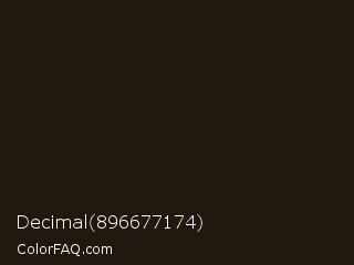 Decimal 896677174 Color is a very dark orange color and the nearest color is Eternity #211a0e. Hex code #211910 and RGB value is rgb(33,25,16). In RGB color space, this color is composed of 13% red, 10% green, 6% blue, In CMYK color space, this color is composed of 0% cyan, 24% magenta, 52% yellow , 87% black , In HSL color space, this color has a hue angle of 32° , 35% saturation and 10% lightness.